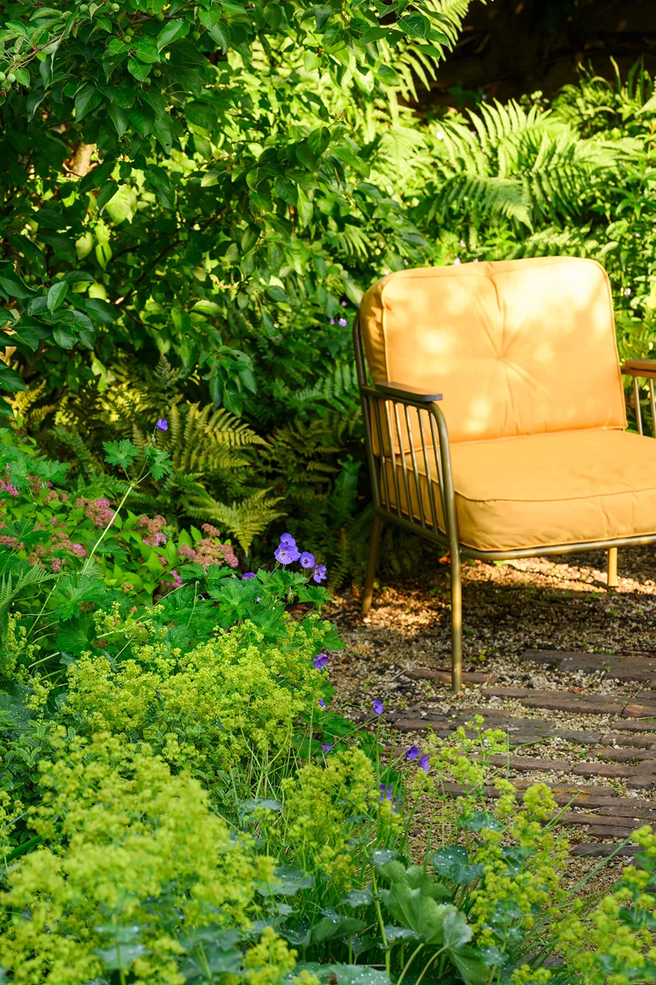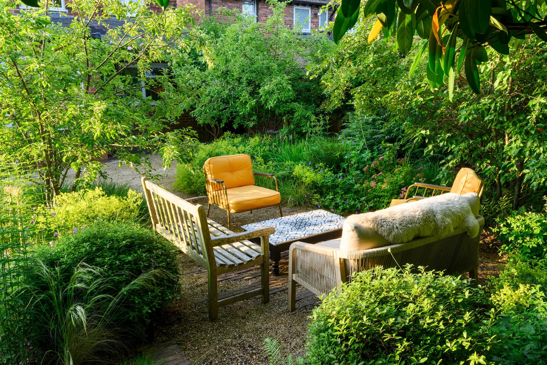 The rear garden takes cues from the wooded glades characteristic of the Surrey countryside, creating a secluded and tranquil retreat. Designed as a wildlife-friendly garden, it is intentionally enclosed to block outside views, offering a peaceful space for relaxation, reflection, and reconnecting with nature.