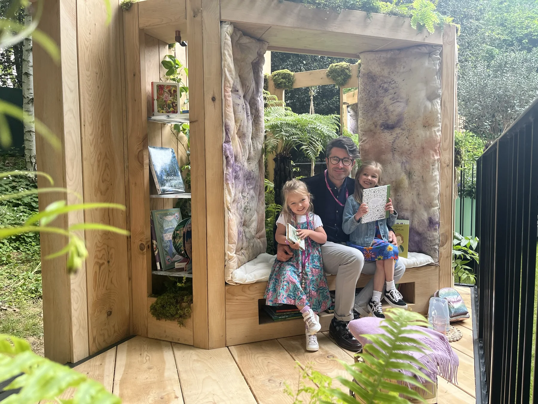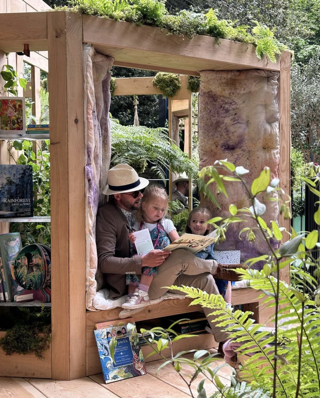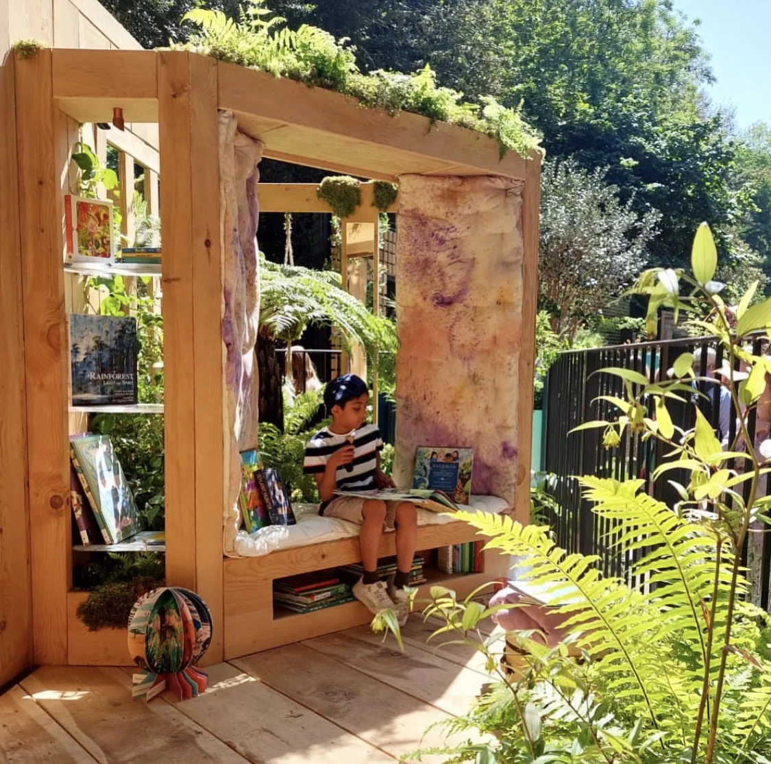 The idea for the Rainforest Conservation garden began with a simple vision: a window seat surrounded by rainforest greens and books — a space where children could discover the wonder of nature and be inspired to protect it. Reading lies at the heart of that idea, transporting us through imagination into distant ecosystems whose well-being depends on our collective actions. Many tropical rainforest species used in UK gardens are now in decline, alongside the flora and fauna of those regions. This garden celebrates the beauty of sustainable, UK-grown timber and plants that echo the richness of global rainforests while thriving in our climate.
