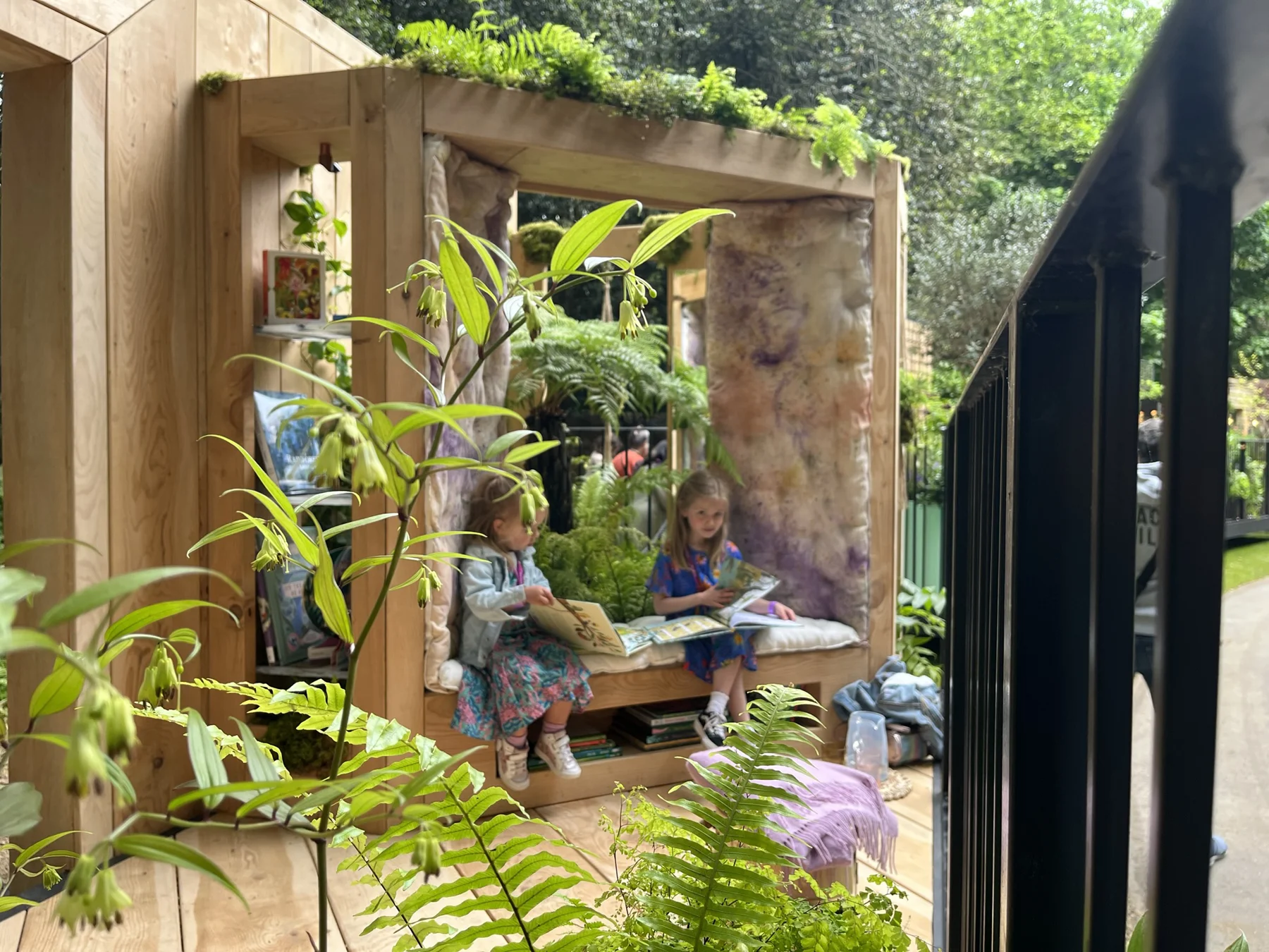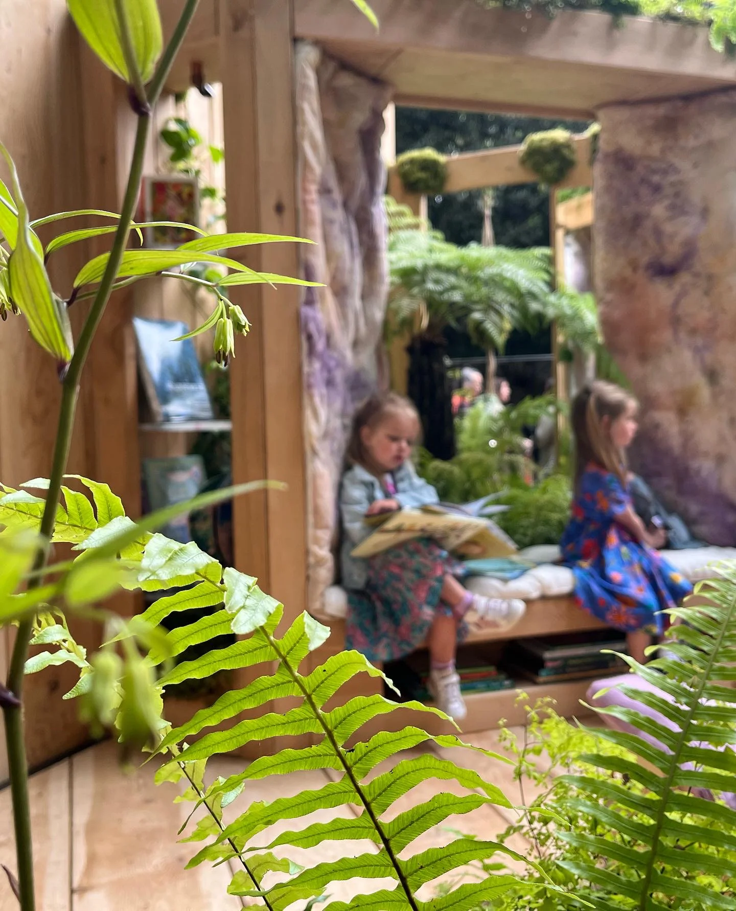The design featured a cushioned reading nook, recycled glass bookshelves, mirrored walls, hanging kokedama, and two planters overflowing with tropical foliage. Children’s books nestled throughout the garden invited visitors to sit, read, and dream amid the greenery.